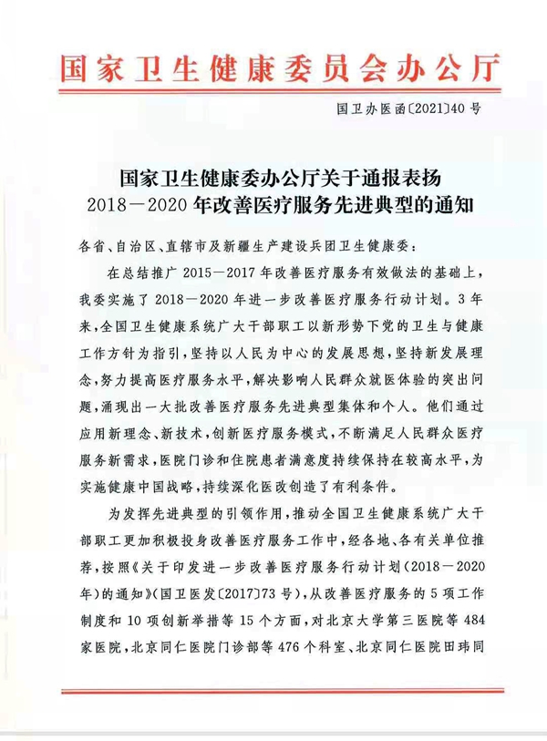 2月2日,国家卫建委国家卫生健康委办公厅发布《关于通报表扬2018-2020年改善医疗服务先进典型的通知》(国卫医发〔2017〕73号),对改善医疗服务先进典型医院、先进科室、先进个人予以通报表扬 ,其中廉江市人民医院麻醉手术科被评为全国改善医疗服务先进典型科室。