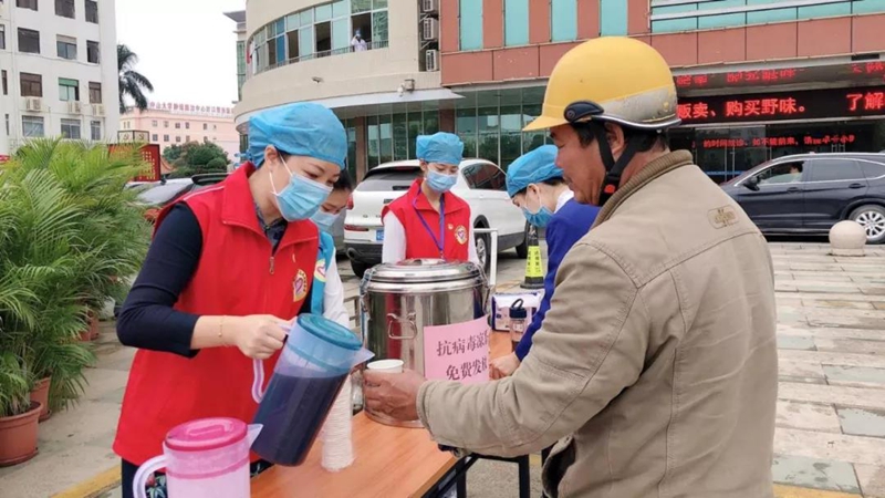 党委办、社工部组织党员志愿者为群众发放抗病毒凉茶