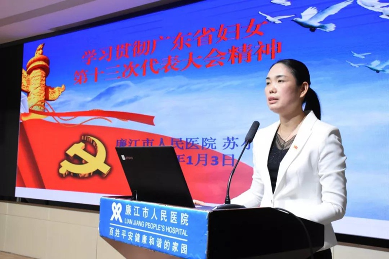 廉江市妇联兼职副主席、廉江市人民医院党委委员、工会主席苏小妹主持会议并传达学习贯彻广东省妇女第十三次代表大会精神
