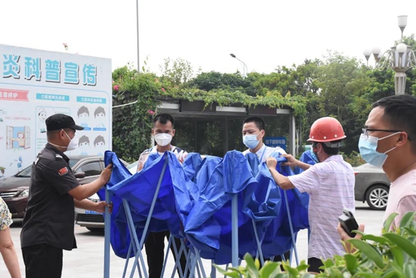 撑起帐篷为市民遮阳,搬来了饮水机和风扇消一消大家的“暑气”,保卫科的工作人员大汗淋漓,一遍一遍喊着“不要着急,排好队”,维持现场秩序,确保核酸检测工作有序进行。