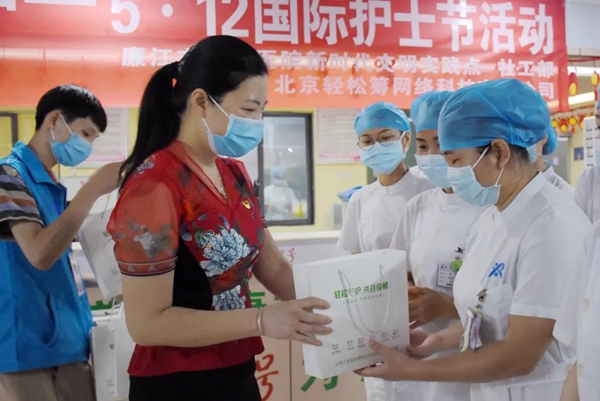 院党委委员、党委办主任钟洁云代表我院护理人员对轻松筹公司的关怀表达了深深的谢意。她充分肯定我院护理工作者在疫情防控中,用自己的汗水、热情和芳华坚守岗位,勇挑重担,用自己的行动诠释着“白衣天使”的新时代赞歌;同时希望护理工作者们在今后的工作中进一步传承和弘扬南丁格尔精神,坚持在“思想建党、文化建院”理念引导,爱岗敬业,无私奉献,坚定信心,大胆探索,改善服务质量,在今后的工作中不断创造新业绩,用行动诠释敬佑生命、救死扶伤、甘愿奉献、大爱无疆的崇高精神,做新时代最可爱的人。(莫琪 陈俊任)