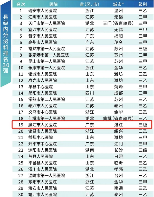 近日,2021中国医院竞争力大会在厦门召开,现场发布了《医院蓝皮书:中国医院竞争力报告(2020~2021)》,廉江市人民医院在“2020年县级医院100强”排行榜中名列第27位,广东省县(市)级医院名列第3位。在广东仅次高州和普宁,再次喜提“探花”。