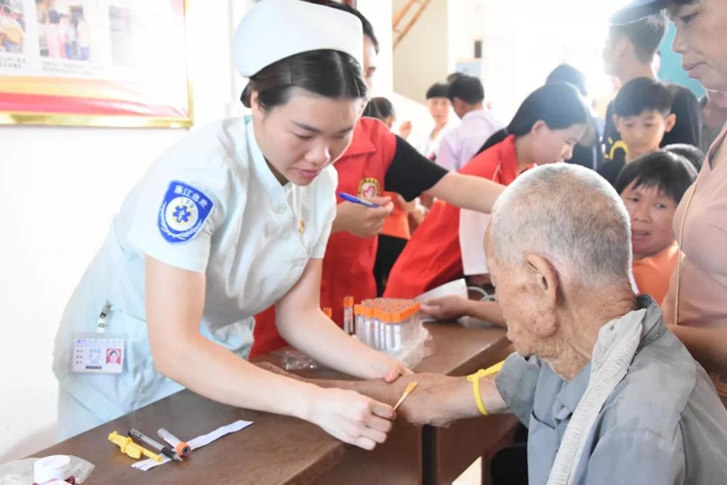 义诊现场,医护人员为前来就诊的贫困户提供问诊、量血压、测血糖、抽血、测量身高体重、X光、心电图检查等医疗服务,并为其建立健康服务档案。针对行动不便无法来到义诊现场的村民,医护人员还走村串户、上门为贫困户进行健康检查,细心询问饮食和生活习惯,结合身体状况给予健康指导意见,并耐心解读健康扶贫政策,确保建立和完善健康服务档案落实到户。