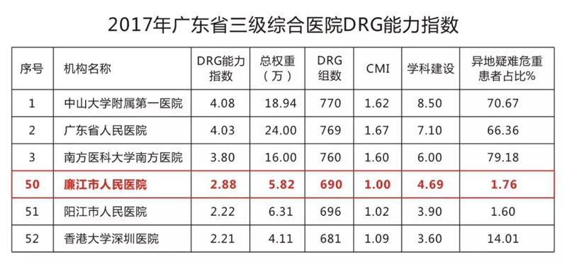 廉江市人民医院以DRG能力指数2.88、总权重5.82万、DRG组数690个、CMI(病例组合指数)1.00、学科建设4.69、异地疑难危重患者占比1.76%的成绩,在全省96家三级综合医院DRG能力指数评价榜单中名列第50位,在全省57家县级人民医院中列居第2位,仅次于高州市人民医院,摘下2017年全省县级人民医院DRG能力指数评价“榜眼”。