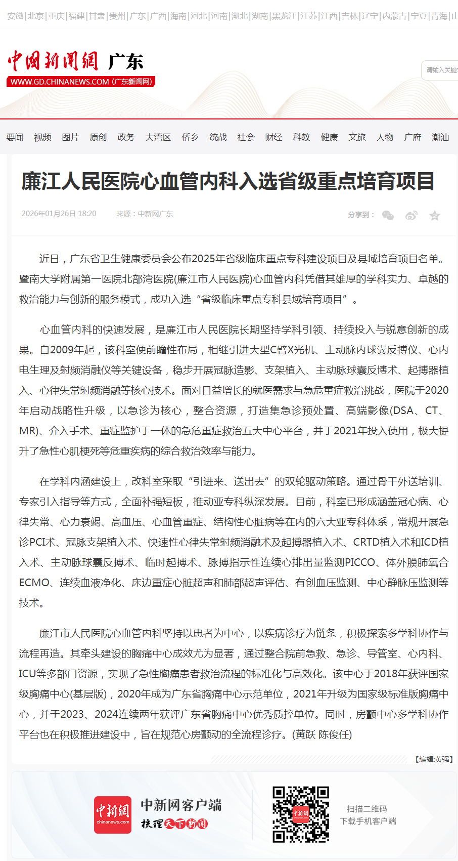 【中新网广东】廉江人民医院心血管内科入选省级重点培育项目