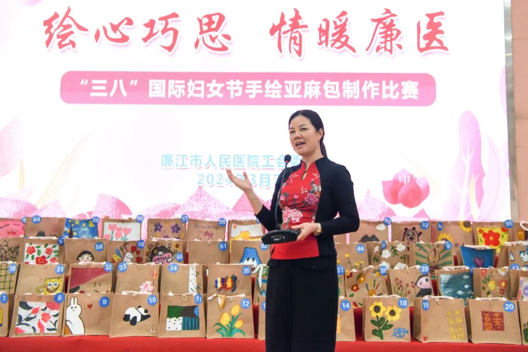 为庆祝“三八”国际妇女节,丰富员工文化生活,3月7日下午,廉江市人民医院举办“绘心巧思 情暖廉医 ‘三八’国际妇女节手绘亚麻包制作比赛”,100名女员工参加比赛,医院党委副书记钟洁云、工会相关负责人等参加活动。