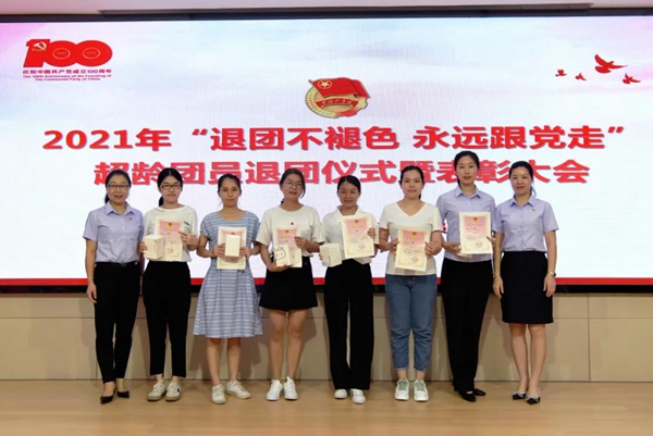 团委书记吴玉兰为活动致辞,活动表彰了 2020-2021年度“先进团支部”“优秀共青团员”“优秀共青团干部”,离团代表发言并带领超龄团员重温入团誓词。党委委员、党委办主任钟洁云,团委书记吴玉兰为超龄团员摘下团徽并颁发了离团证书和纪念品。