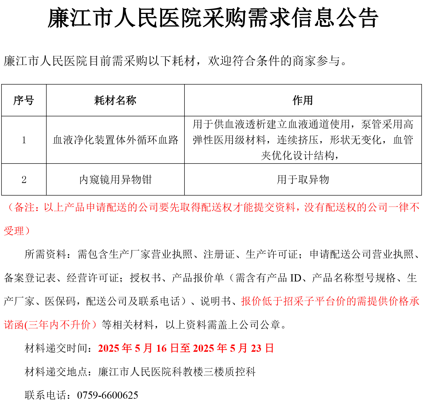廉江市人民医院采购需求信息公告(2025.05.16)