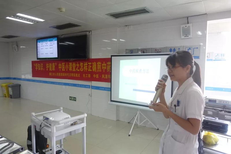 课堂首先由我院医务社工晖仔向群众介绍开展本次中医小课堂的内容和目的,随后中医风湿科黄红霞医生为群众讲解如何正确煎中药。课堂采取课件演示、理论讲授、现场互动等形式开展。黄红霞医生以其深厚的中医知识、独到的认知见解向群众讲授了煎中药相关知识。(伍铭)
