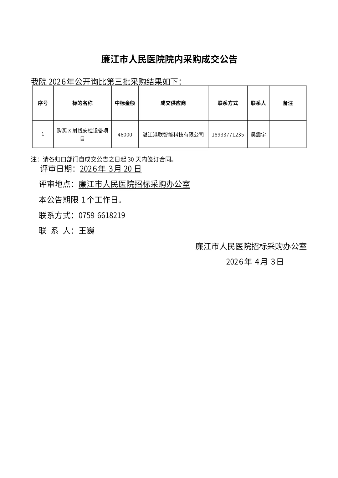 廉江市人民医院院内采购成交公告